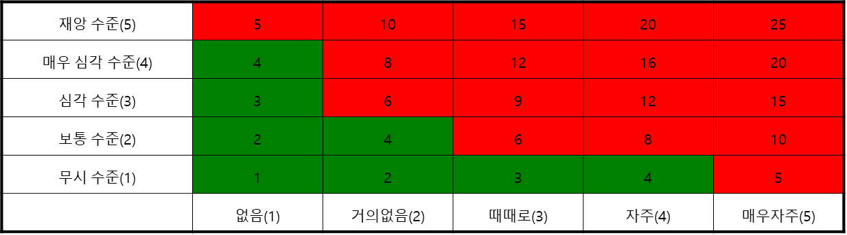 - 위험 매트릭스를 사용하여 심각도와 발생 가능성을 산정:
