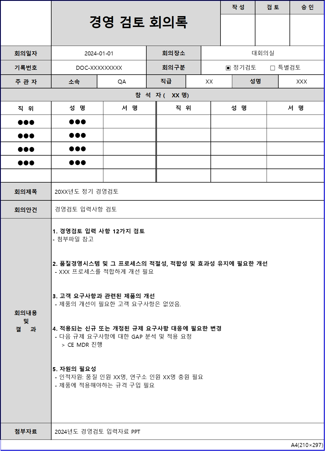 만약 회사에서 전자결재를 이용해서 회의록을 작성하고 있다면, 별도의 경영 검토 회의록 양식을 만들지 않고 회의록에 작성해도 무방합니다. 다만, 내용을 작성할 때 경영검토 입력/출력 사항을 구분하여 작성하면 심사가 용이합니다.