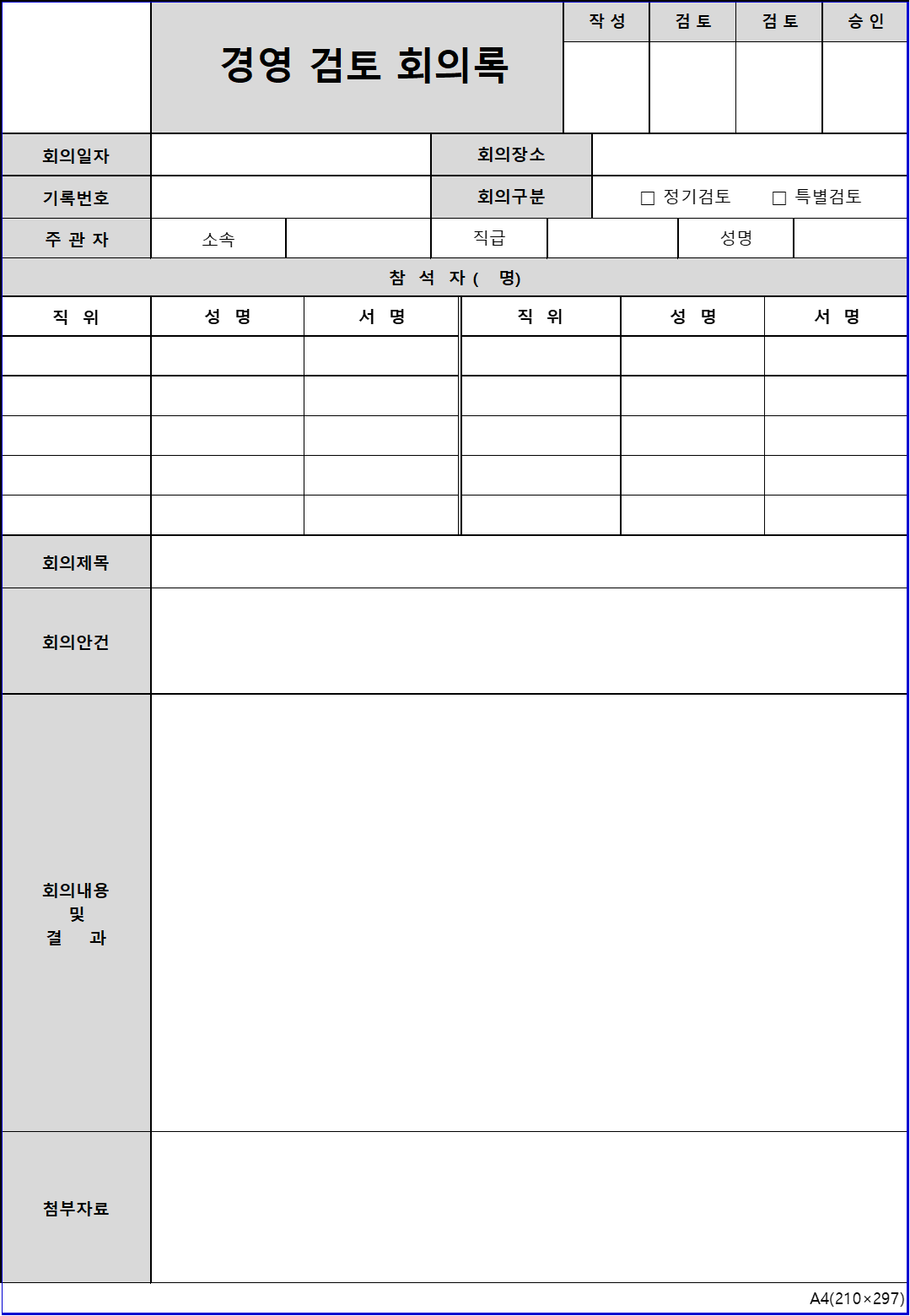 경영검토 회의록 양식은 일반적인 회의록 양식과 크게 다르지 않습니다.