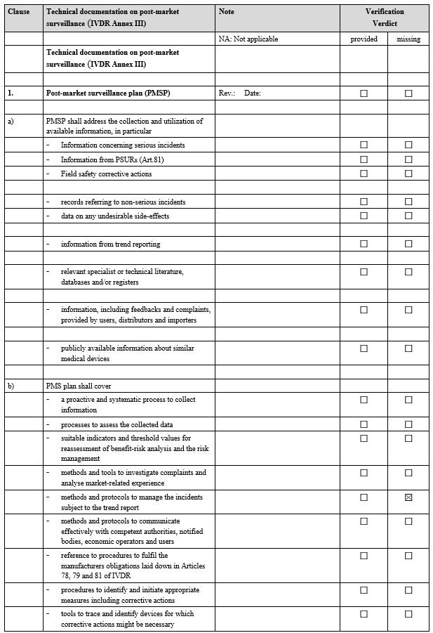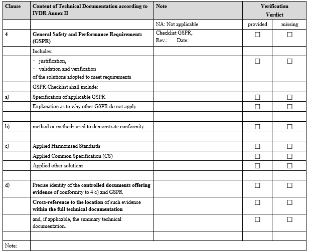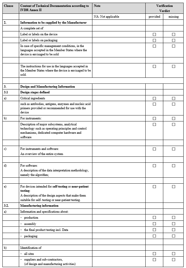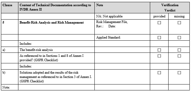 IVDR Checklist는 IVDR Annex II 및 Annex III에서 요구하는 항목을 검토하고 준비 상황을 점검하기 위한 도구입니다. 이 체크리스트는 제조업체가 요구사항을 체계적으로 충족했는지 확인하고, 누락된 부분을 신속히 파악하는 데 도움을 줍니다.