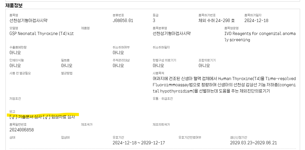 또한, 의료기기안심책방을 통해 유사제품의 허가내역을 확인하여 해당 제품이 임상시험자료 심사를 받았는지, 단순 기술문서 심사를 받았는지를 확인할 수 있습니다. 아래 사진과 같이 제품을 검색했을 때 " [√] 기술문서 심사 [√] 임상자료 심사"에 모두 체크되어 있으면 임상자료 심사를 받은 제품입니다.
