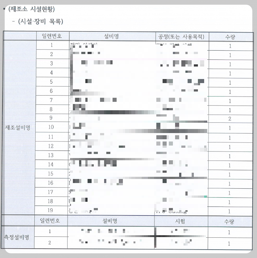 제조소 시설현황은 GMP 신청품목의 제조 및 검사에 사용되는 설비명과 관련 공정(또는 사용목적)을 기입하면 됩니다. 측정설비에는 검사에 사용하는 지그류, 계측기류를 기입하면됩니다. 제품표준서의 설비 목록을 그대로 기입하면 제일 좋습니다. 동일한 설비가 여러대 있는 경우에는 설비명은 한번만 작성하고 수량을 표시해줍니다.