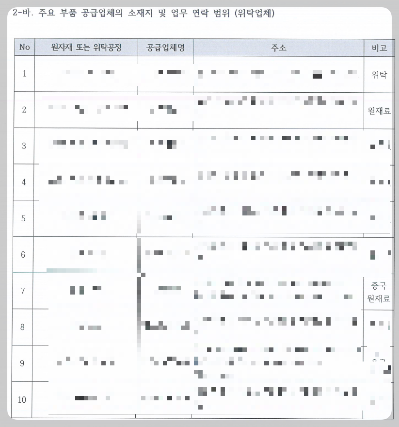 주요 공급업체명 및 업무법위에는 위탁업체 및 주요 원자재 공급업체의 정보를 기입합니다. 거래하는 원자재 또는 위탁공정명, 공급업체명, 주소까지 작성해주면 됩니다. 비고란에는 위탁업체인지, 원재료 공급업체인지를 추가로 작성하면 좋습니다. 해외 원재료 공급업체의 경우, 공급업체명과 주소는 영어로 기입해도 무방합니다.