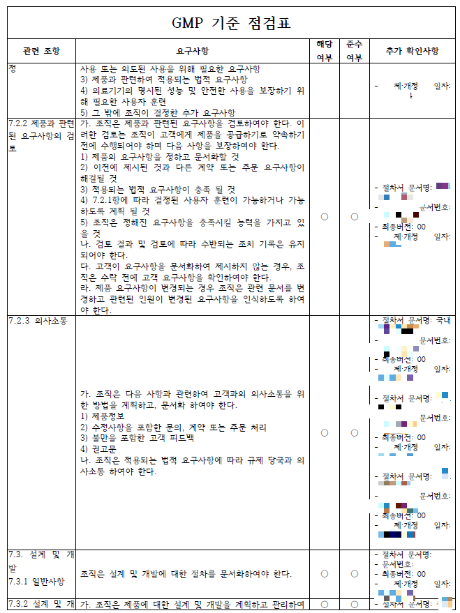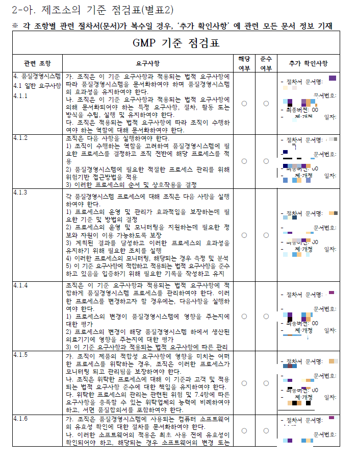 GMP 신청서류 중 제조소의 기준 점검표의 경우, GMP 기준 점검표의 각 조항별 요구사항이 제조사의 품질절차서에 어떻게 적용되어 있는지를 보여주는 문서입니다.