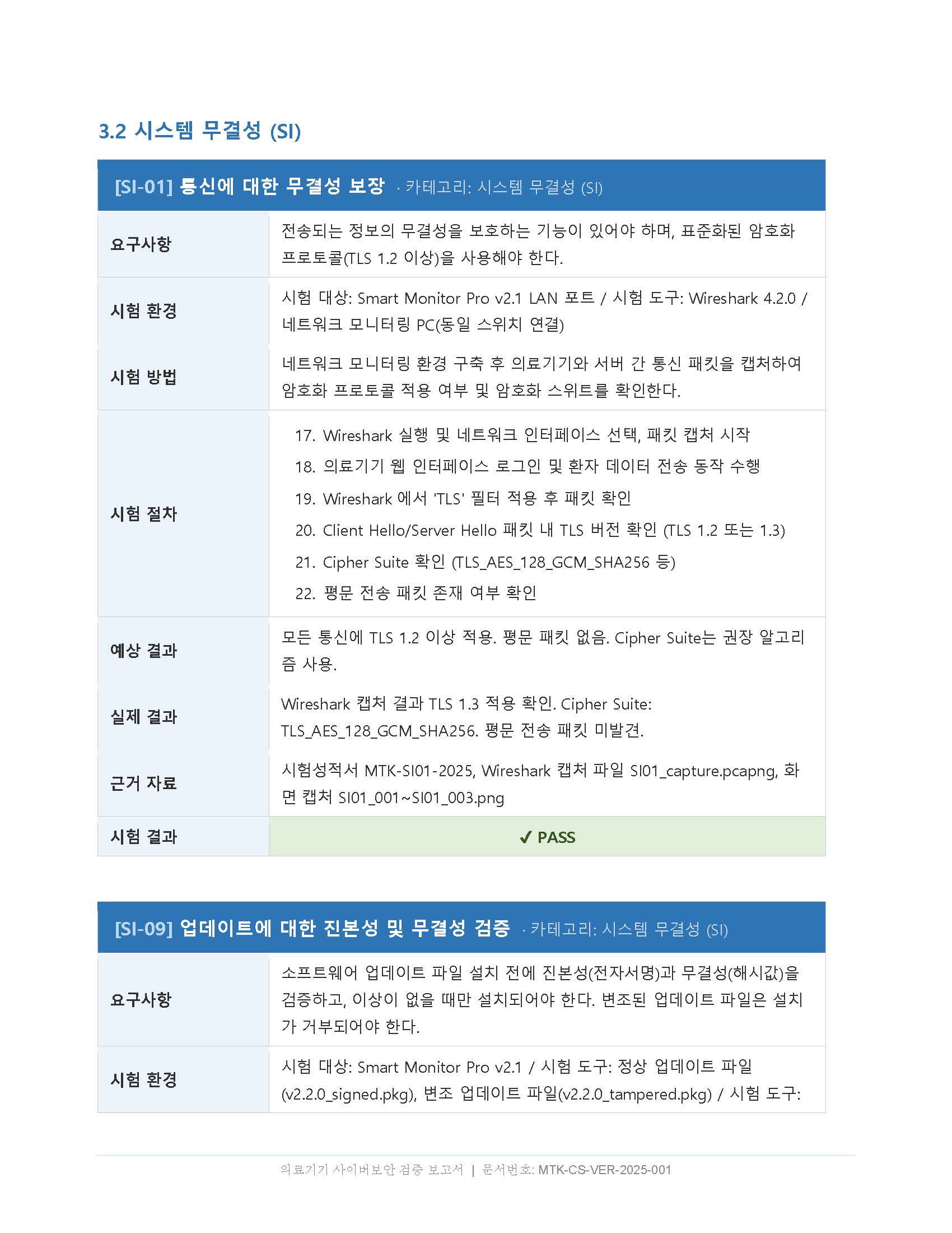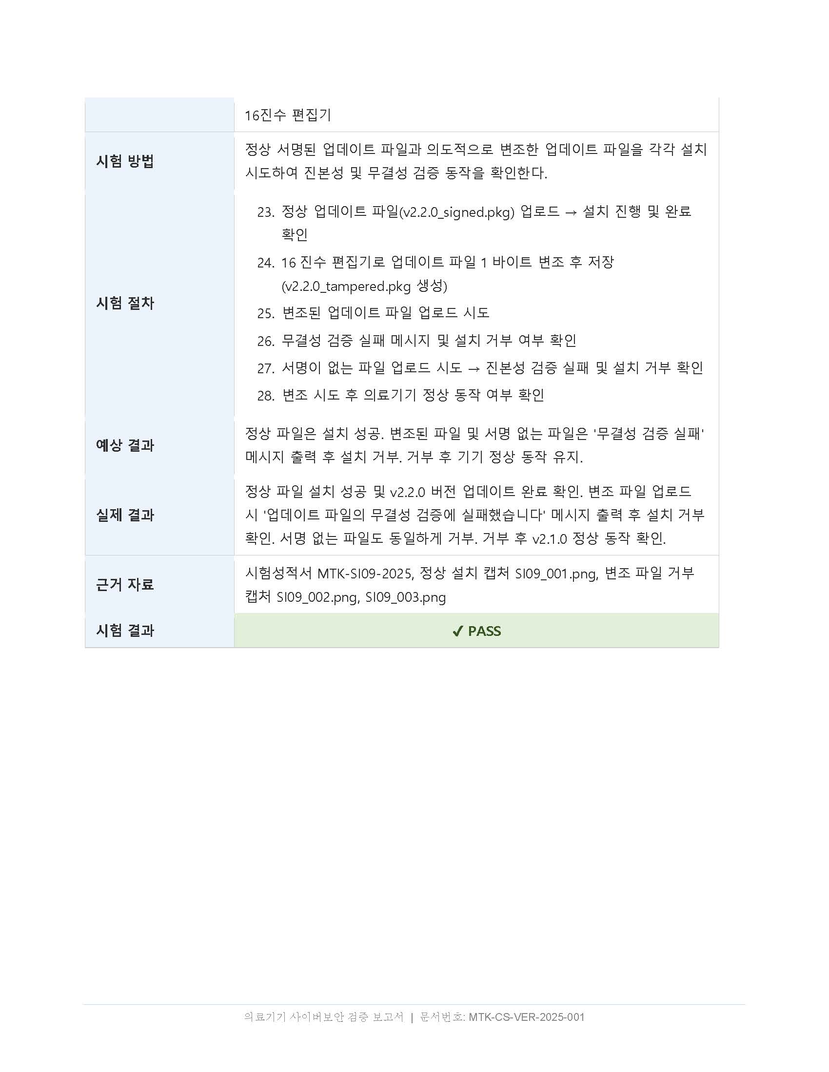 업데이트 무결성(SI-09) — 정상 서명된 업데이트 파일은 설치 성공, 서명이 변조된 파일은 설치 거부되는 두 가지 시나리오를 모두 보여줘야 합니다. 하나만 있으면 심사에서 보완 요청이 옵니다.