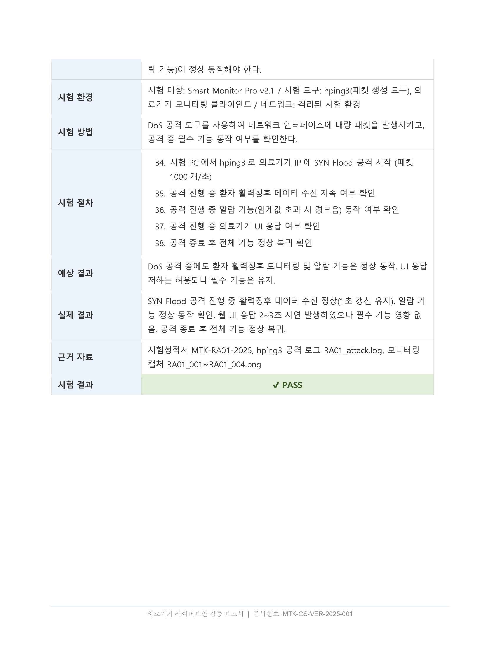 DoS 방어(RA-01) — 네트워크 패킷 생성 도구로 공격 트래픽을 발생시킨 뒤 의료기기의 필수 기능이 정상 동작하는 화면을 함께 캡처합니다. 공격 중 기기가 다운되면 당연히 통과 불가입니다.