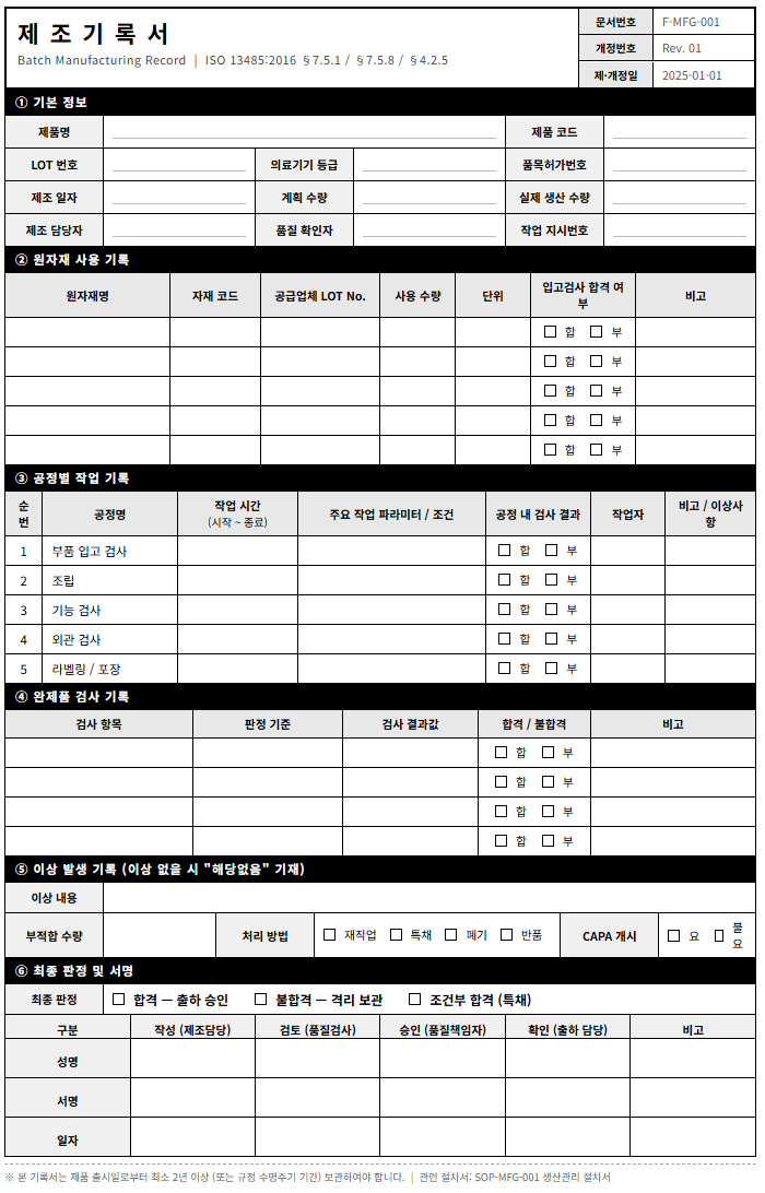 1. 의료기기 제조기록서 양식